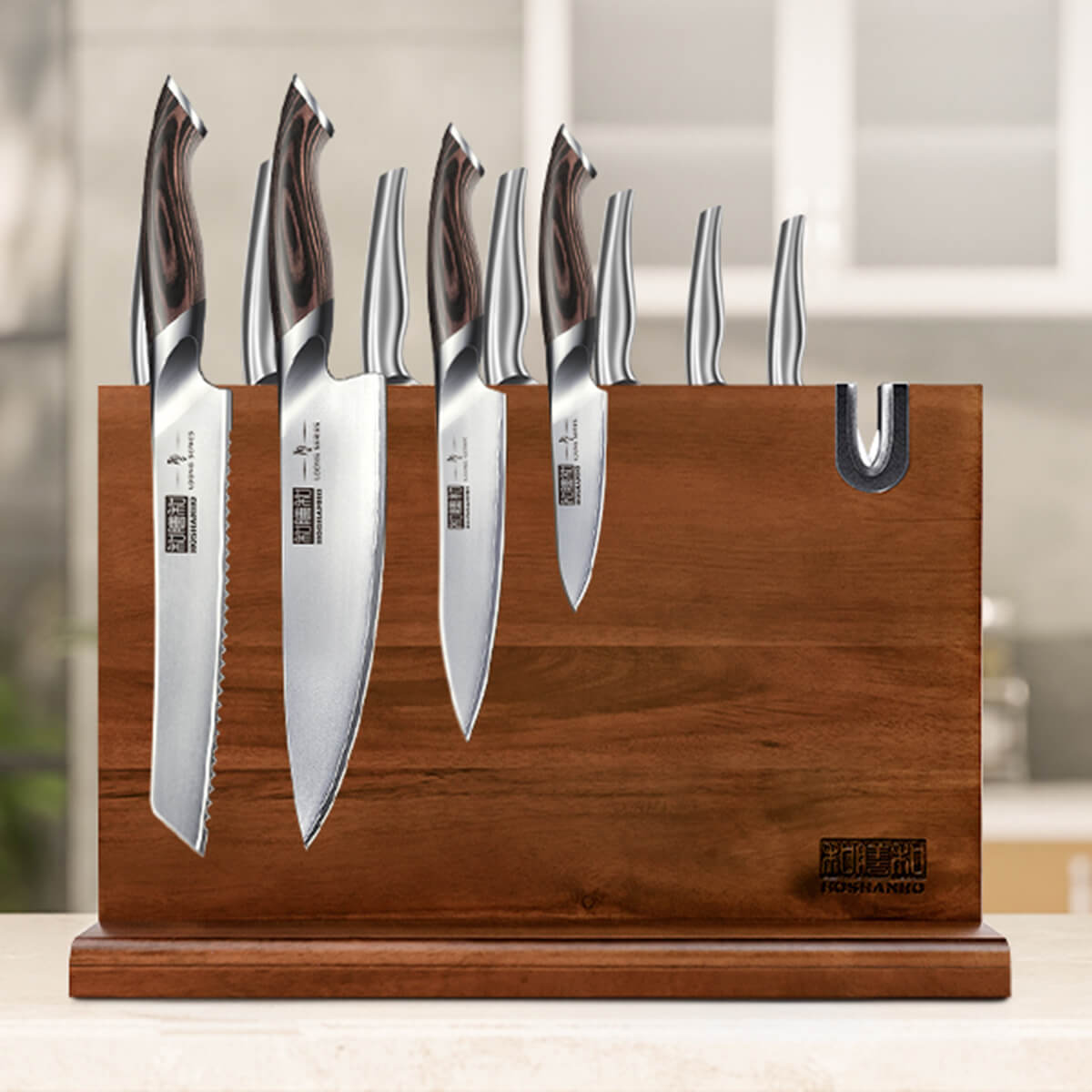 - Madera de acacia natural: Material resistente, duradero y elegante que protege el filo de los cuchillos.