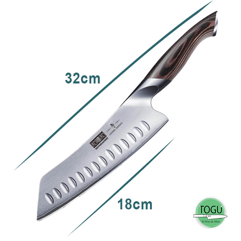 El diseño del Santoku facilita cortes precisos y controlados, especialmente en vegetales, carnes y pescados. Su hoja permite un movimiento eficiente sobre la tabla, mientras que el mango ergonómico con acabado tipo madera proporciona un agarre cómodo y seguro, mejorando el equilibrio del cuchillo y reduciendo la fatiga durante el uso prolongado.