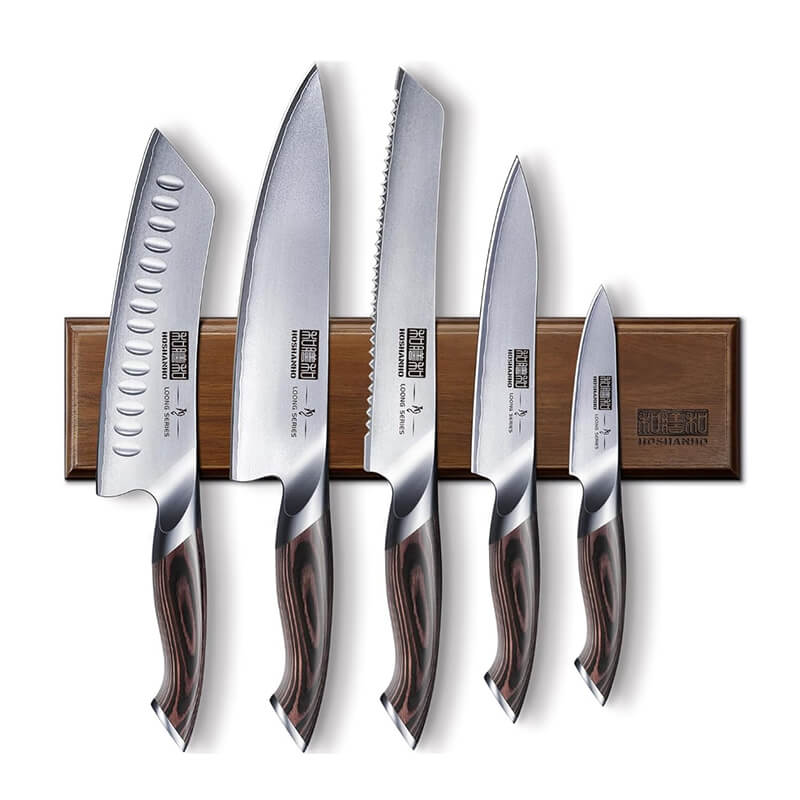 El set de cuchillos de acero japonés AUS-10 de 5 cuchillos con base magnética para pared ofrece una solución completa, funcional y elegante para la cocina. Diseñado para cubrir todas las tareas esenciales de corte, este set combina rendimiento, durabilidad y organización, ideal tanto para uso doméstico como profesional.
